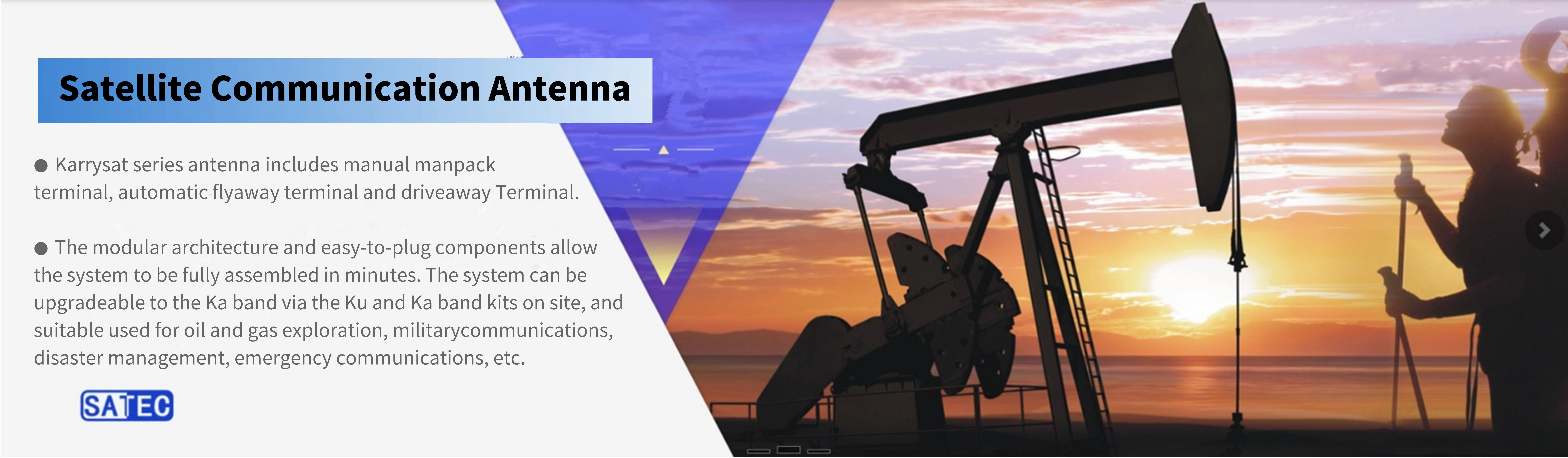 SATEC, Founded in 2009, is a high-tech enterprise dedicated to the R&D, manufacturing and sales of Satellite Communication Terminals, Including,Flyaway(Manpack),Driveaway,Maritime Satcom,UAV Satcom,Phased Array Terminals, and other Custiomzed Antenna SystemOur products are widely used in emergency communication, live broadcasting, remote education and security communication, etc. Now, Satec serves China Satcom, China Petroleum, Sinopec Group, China Telecom, China Mobile, China Unicom, Chinese Academy of Sciences, CETC, SES, Eutelsat, ST Engineering iDirect, Spacebridge and other outstanding enterprises.